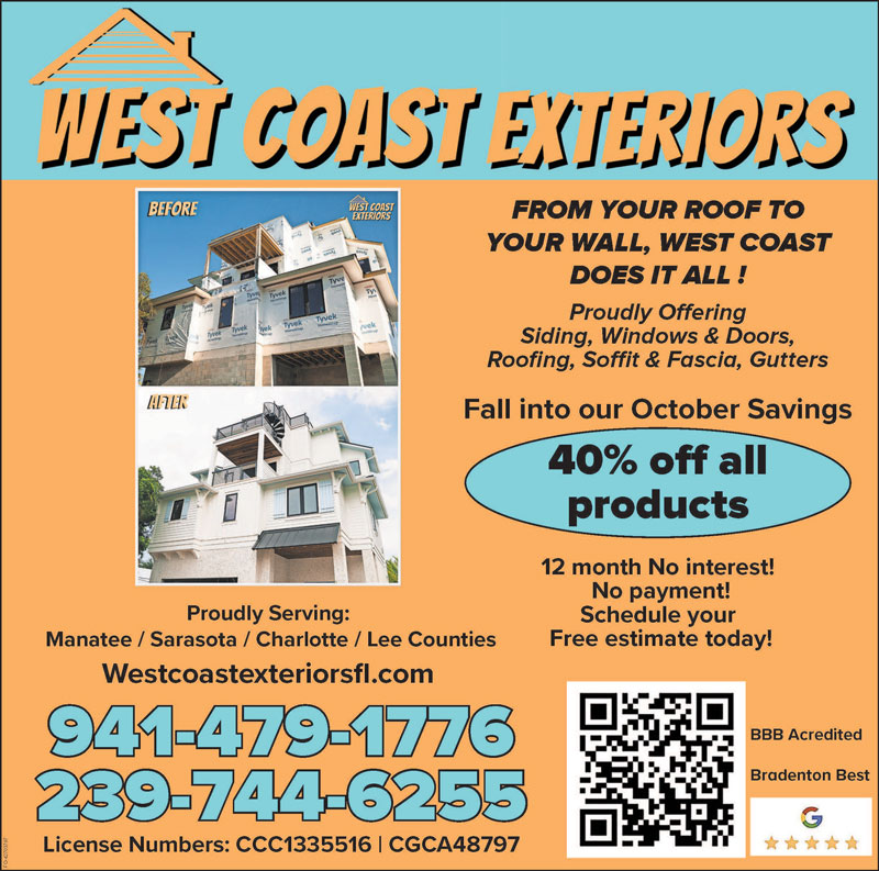At West Coast Exteriors, we take pride in being Southwest, FL's trusted full exterior renovation contractor. With years of experience and a commitment to quality craftsmanship, our team specializes in transforming homes with durable, stylish, and energy-efficient solutions. From roofing and siding to windows, doors, and outdoor living spaces, we handle every aspect of exterior renovation with precision and care. Whether you’re looking to boost curb appeal, increase property value, or protect your home from Florida’s coastal climate, West Coast Exteriors delivers results you can rely on.